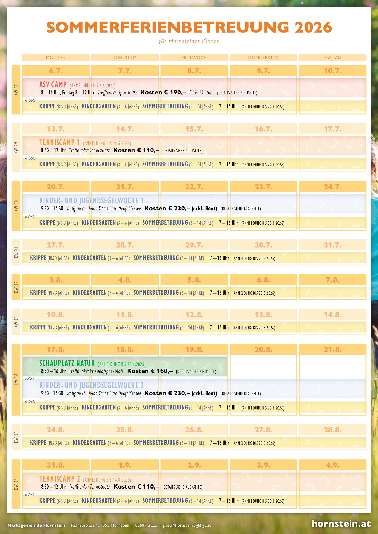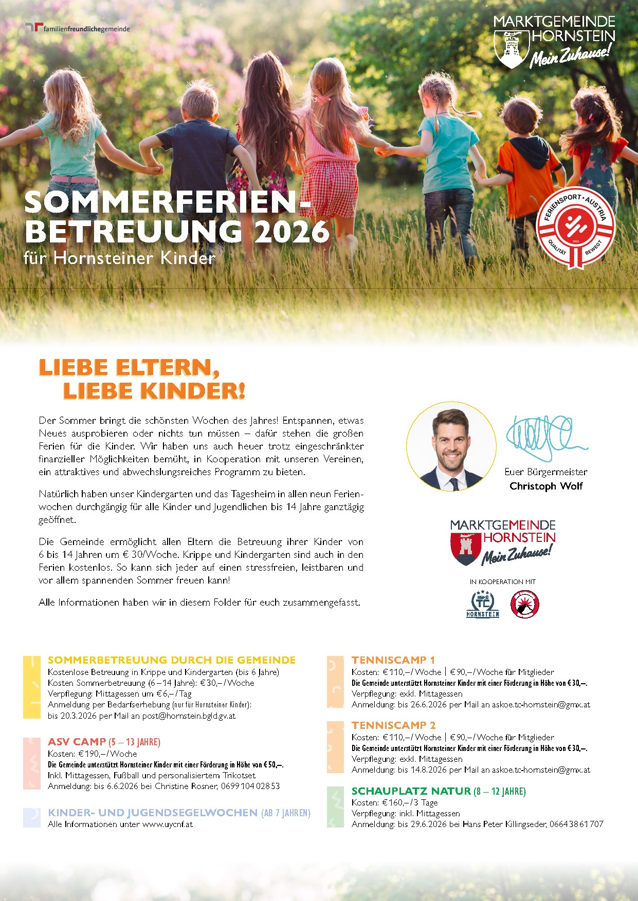 Der Sommer bringt die schönsten Wochen des Jahres! Entspannen, etwas Neues ausprobieren oder nichts tun müssen – dafür stehen die großen Ferien für die Kinder. Wir haben uns auch heuer trotz eingeschränkter finanzieller Möglichkeiten bemüht, in Kooperation mit unseren Vereinen, ein attraktives und abwechslungsreiches Programm zu bieten. Natürlich haben unser Kindergarten und das Tagesheim in allen neun Ferienwochen durchgängig für alle Kinder und Jugendlichen bis 14 Jahre ganztägig geöffnet.
